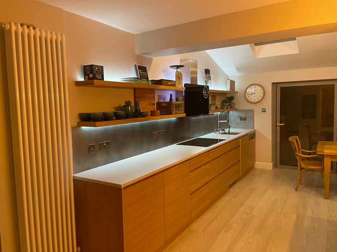Open shelving adds a sense of openness, with decor and practical elements thoughtfully curated for both aesthetics and utility. Subtle under-shelf lighting enhances the workspace and highlights the textured backsplash, adding depth and a soft ambiance to the room.