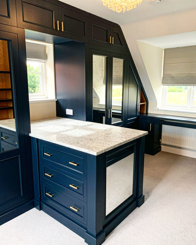 This bespoke fitted wardrobe exudes sophistication and practicality, perfectly tailored for a sloped-ceiling room. The deep navy cabinetry, accented with brushed brass hardware, creates a bold and timeless aesthetic. Mirrored panels integrated into the doors not only enhance the sense of space but also bring functionality and elegance to the design.
